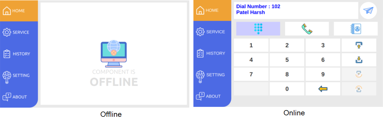 Giao diện: (1) Home – (2) Service – (3) History – (4) Setting – (5) About